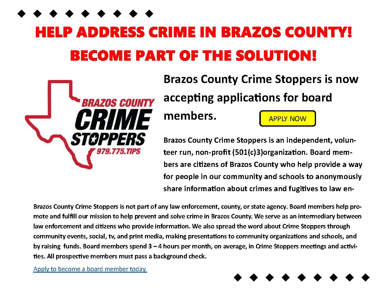 Brazos County Crime Stoppers collaborates with community members, law enforcement, and the media to help solve and prevent crime in Brazos County. Crime Stoppers helps you overcome fear of retaliation by guaranteeing your anonymity and the belief that there is nothing you can do about criminal activity in your community. By providing the information you know anonymously through the Crime Stoppers tip line, website, or mobile app, you can help keep your community safe. You submit it to Crime Stoppers, we'll make sure there is nothing in it that might identify you, and we will pass it along to law enforcement. Crime Stoppers helps law enforcement get information out about crimes for which they need information. Crime Stoppers also works with the media to reach out to you.